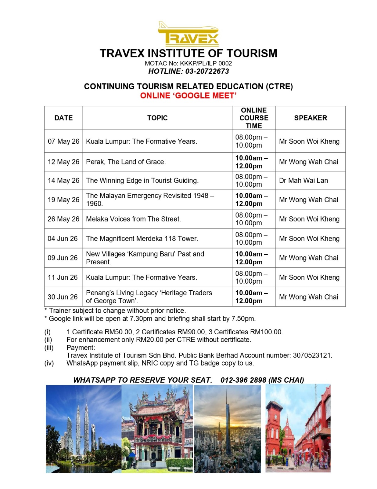 (iii) Payment: Travex Institute of Tourism Sdn Bhd. Public Bank Berhad Account number: 3070523121.